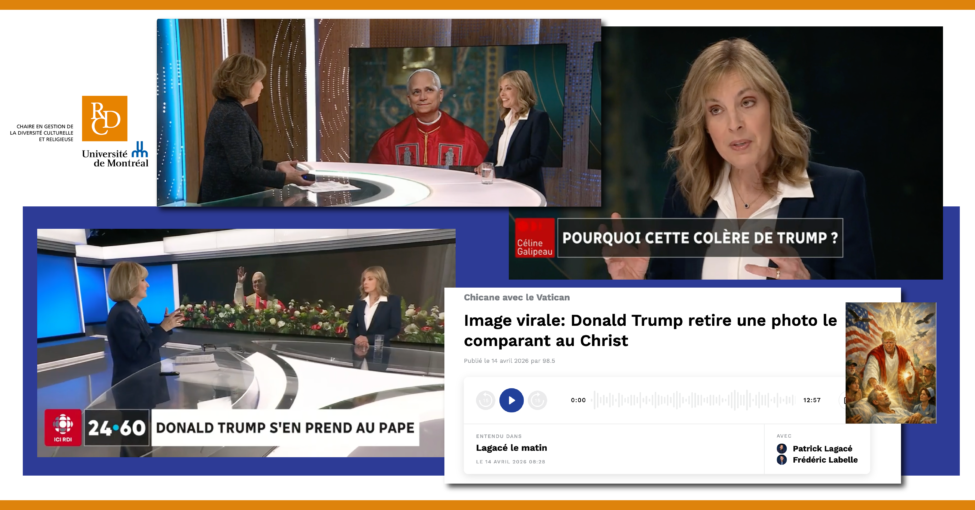 Entrevue avec Solange Lefebvre, « Polémique religieuse : Trump recule après une image controversée », Réseau de l’information, Radio-Canada, 13 avril 2026.